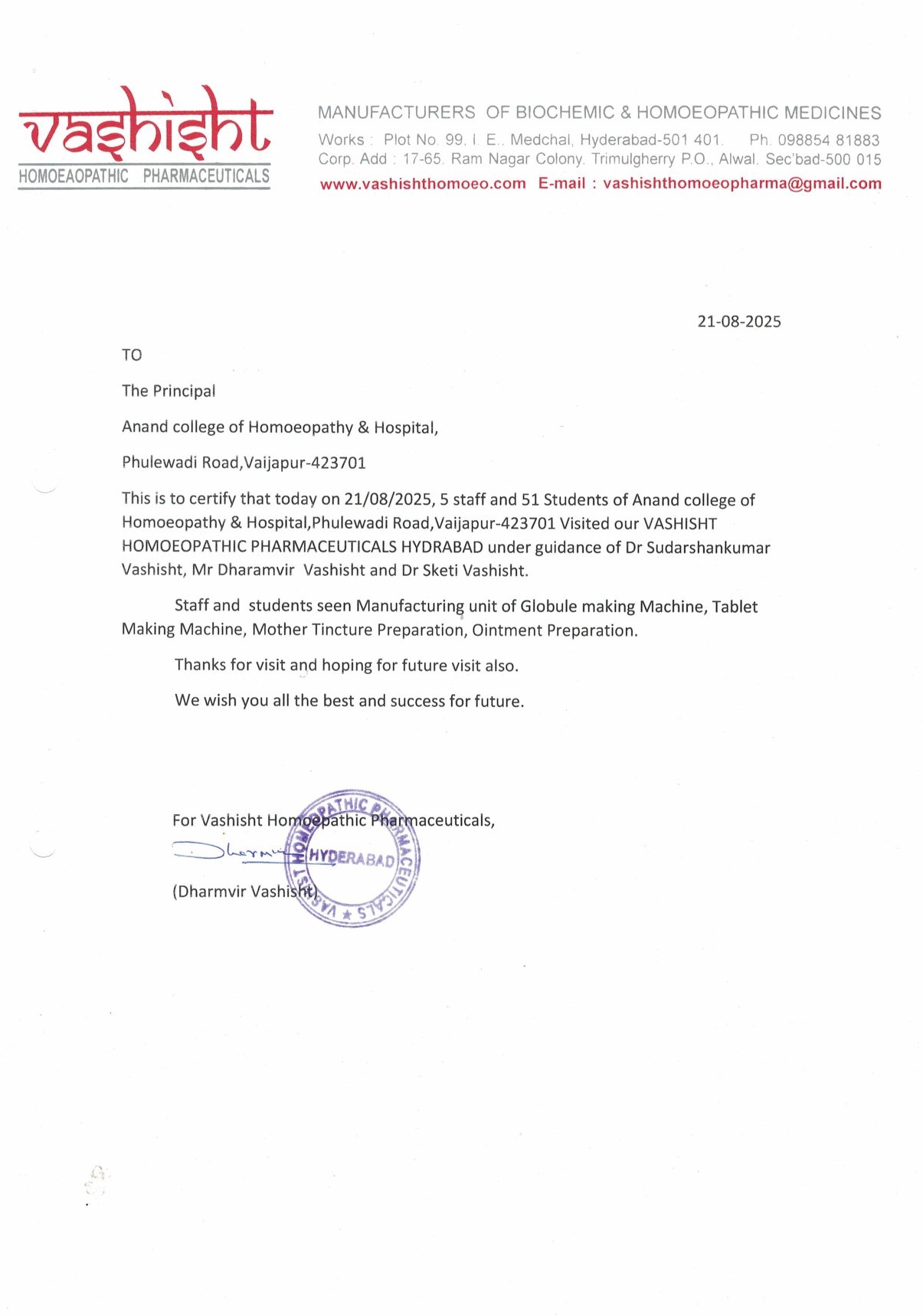 Pharmacy tour to Vashisht Homoeopathic Pharmacy, Hyderabad Batch 2024-25